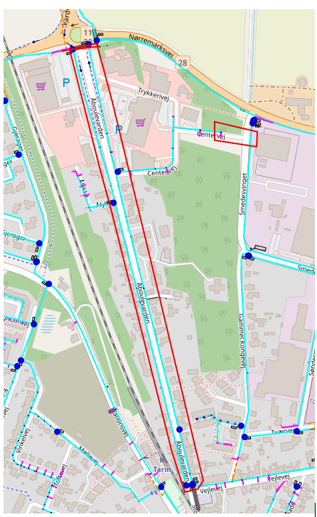 De berørte ledninger er indenfor den røde markering. Lyseblå er hovedledninger og lilla er stikledninger.